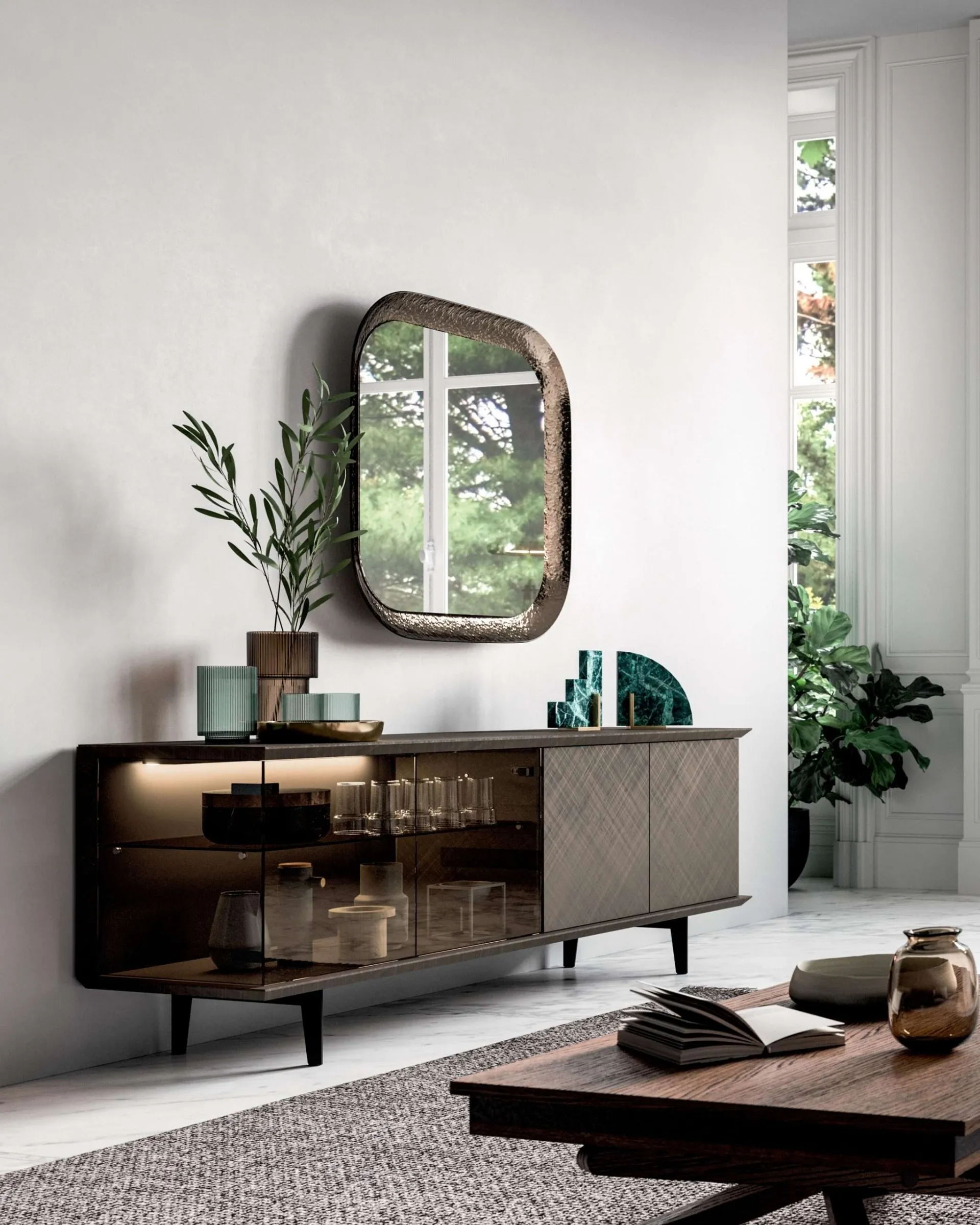 For lovers of the furniture sector, this sideboard model with modern lines guarantees the excellence of the well-known and renowned brand: contact us for information and quotes. Optimize your living room according to your housing problems: discover in our showroom a rich catalog of living room furniture , even in glass like the model shown in the photo. If what you are looking for is a solid, beautiful and refined sideboard to better organize your living room, let yourself be inspired by the most beautiful modern sideboards from the best home decor manufacturers. The Brera Vetro sideboard by Ozzio present here with a glass finish is the perfect purchase, as it gives an elegant touch to the living room.