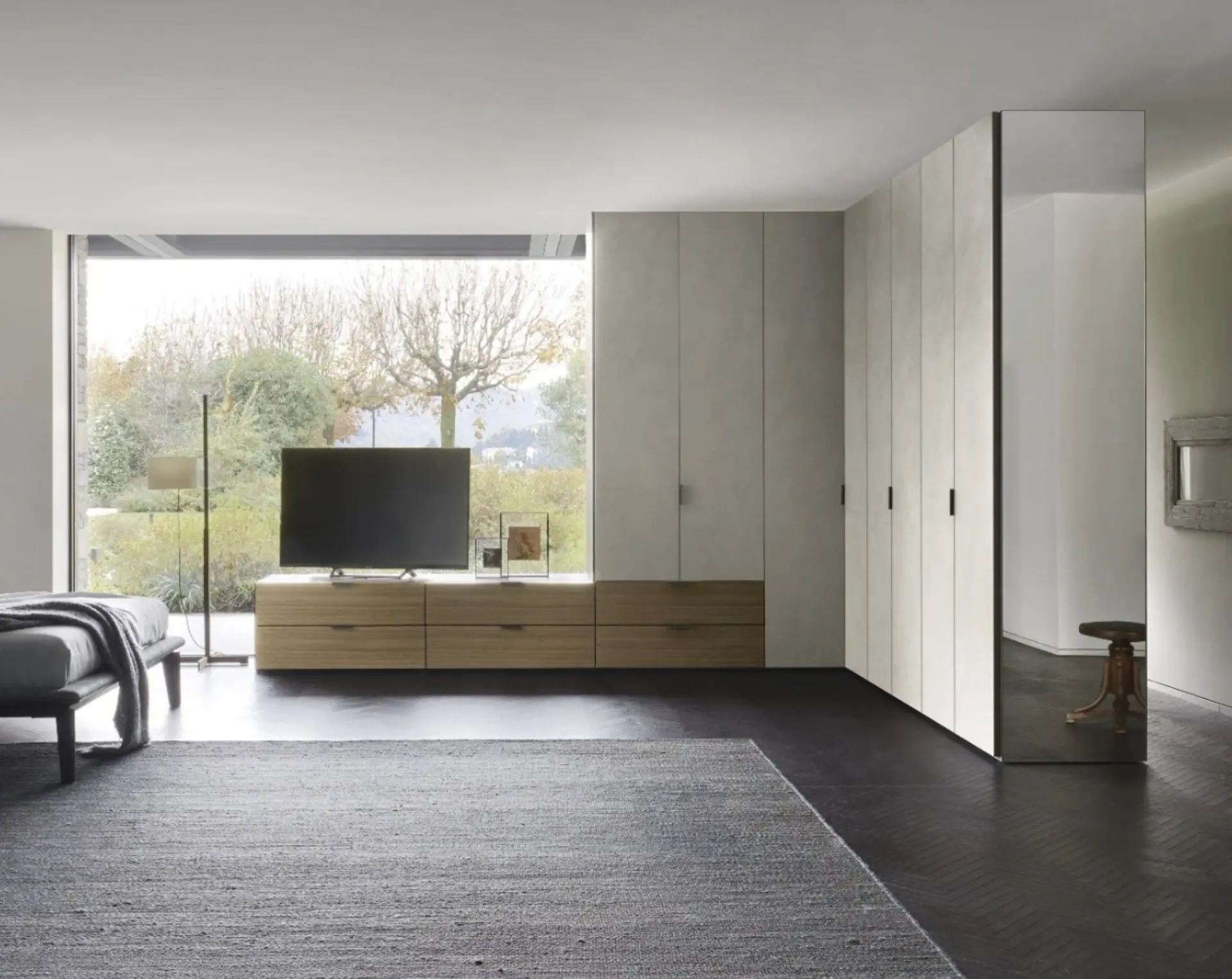 To perfectly set up a functional and aesthetically pleasing room, choose the most original solutions from the best brands, such as high-quality beds, wardrobes, and bedside tables. Contact us and discover more about our Home Furnishing line: you can complete the sleeping area with a diverse range of modern storage options, like the melamine wardrobe in the photo. Corner wardrobe Collage by Sangiacomo: fill out the form to receive all sorts of information and tips on setting up the bedroom you've always dreamed of.